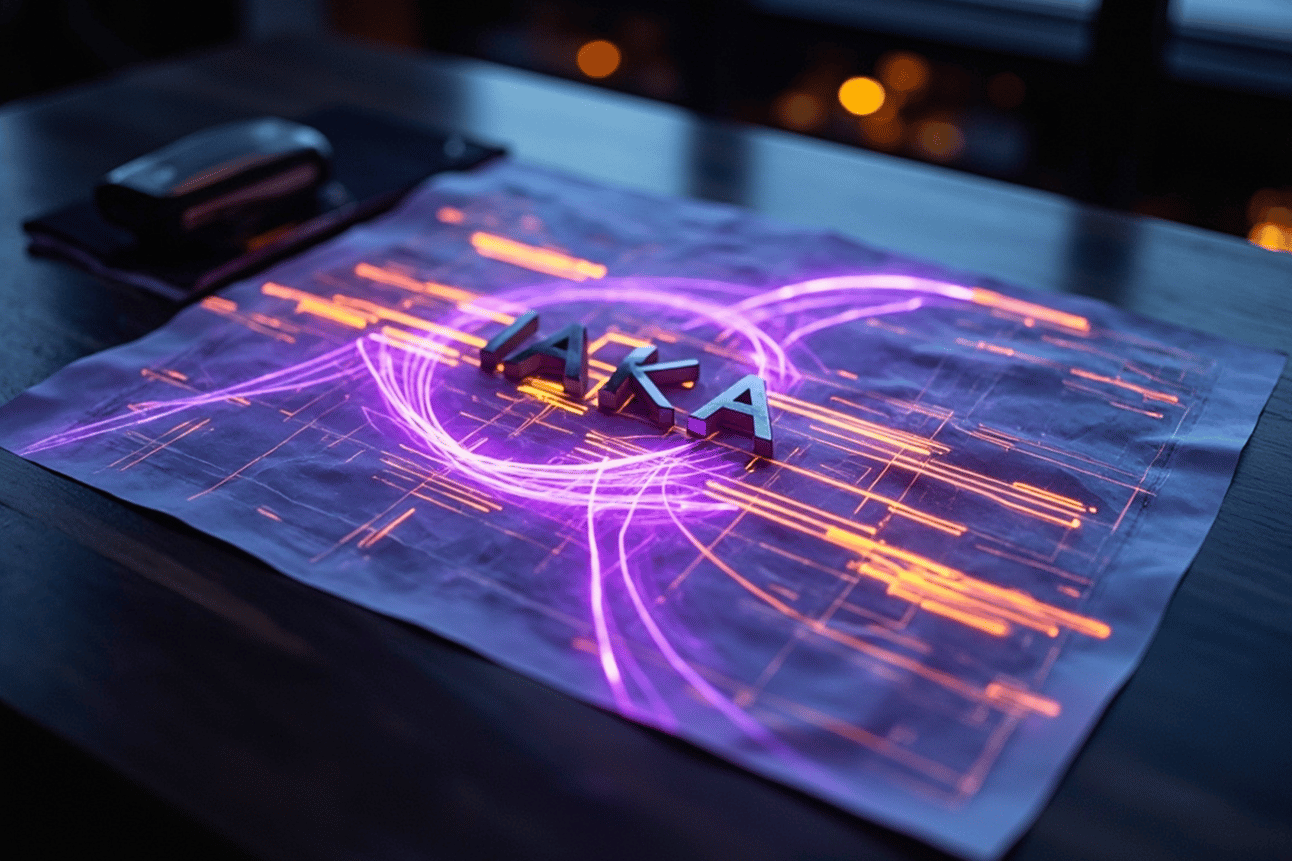 Prompt utilisé (Hailuo Image) : Une photographie d'un plan d'architecte futuriste, étalé sur une table en bois sombre. Au centre du plan, le titre du projet est clairement visible et écrit en lettres capitales : "IAKA". Depuis ce titre, une énergie lumineuse et colorée, aux teintes de bleu électrique et d'orange vif, s'écoule le long des lignes du plan, comme si elle donnait vie au projet. Le style est un mélange de réalisme photographique et d'art numérique. L'éclairage est dramatique, mettant en valeur le contraste entre le plan technique et la lumiÚre créative et fluide. Haute résolution, détails trÚs nets.